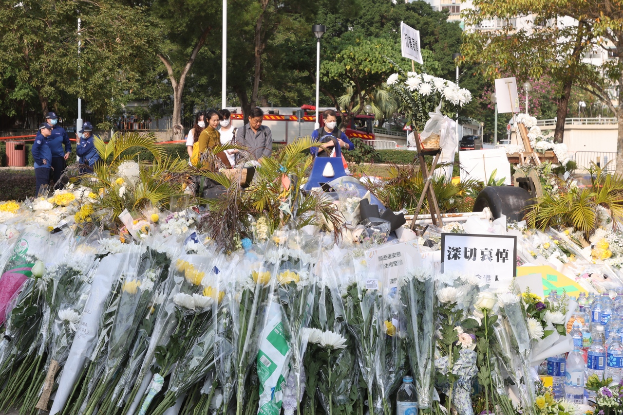 12月5日,香港大埔宏福苑火災現場附近,繼續有市民陸續到場獻花悼念遇難者。香港中通社