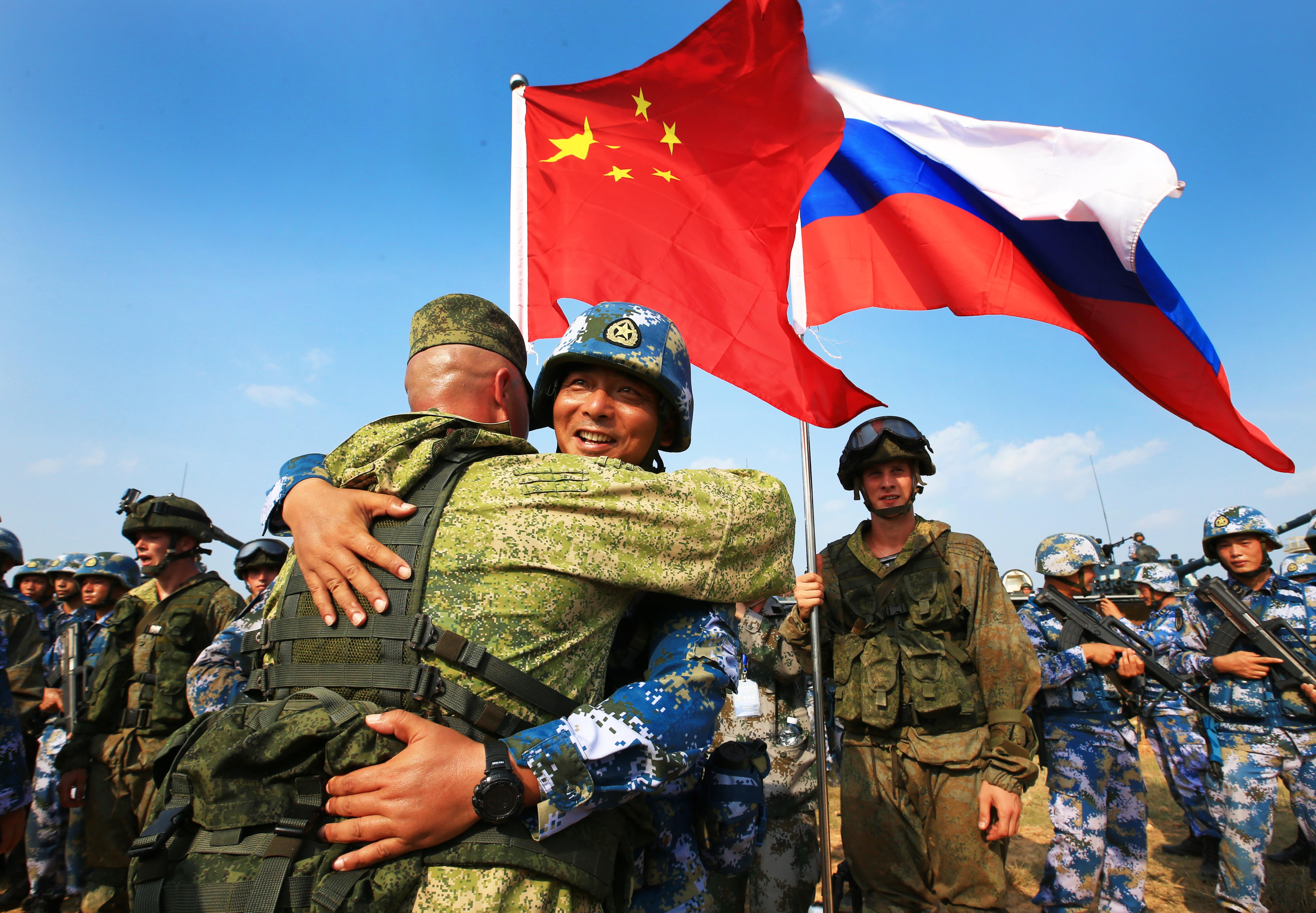 時隔八年,中俄近日再度舉行反飛彈聯合演習。此示意圖為2016年9月14日「海上聯合—2016」中俄海軍陸戰隊聯合演練結束後,兩國海軍陸戰隊指揮員擁抱慶賀。(新華社)