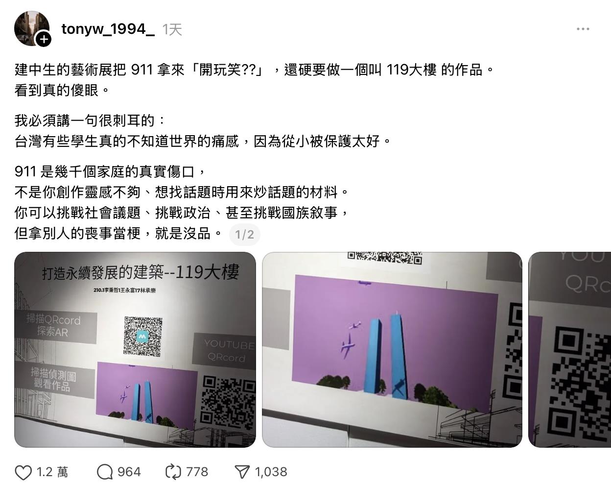 建中有學生日前在課程中以911事件發想作品,並在展覽中展出,但有網友認為,該事件不應拿來炒作、開玩笑。圖/截自「tonyw_1994_」threads帳號