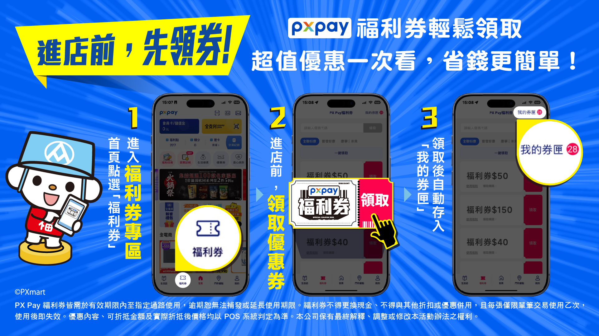 「PX Pay福利券」正式升級上線後,全聯提醒消費者,「進店前記得先領券」。會員僅需三步驟即可完成領取:第一步,進入 PX Pay 首頁點選「福利券」專區;第二步,於進店前開啟 APP,一鍵領取所有可用的福利券;第三步,領券後優惠將自動存入「我的券匣」,到門市結帳即可直接折抵。APP會員介面包括各面額福利券以及券匣中累積張數,整體介面更直覺、易操作。