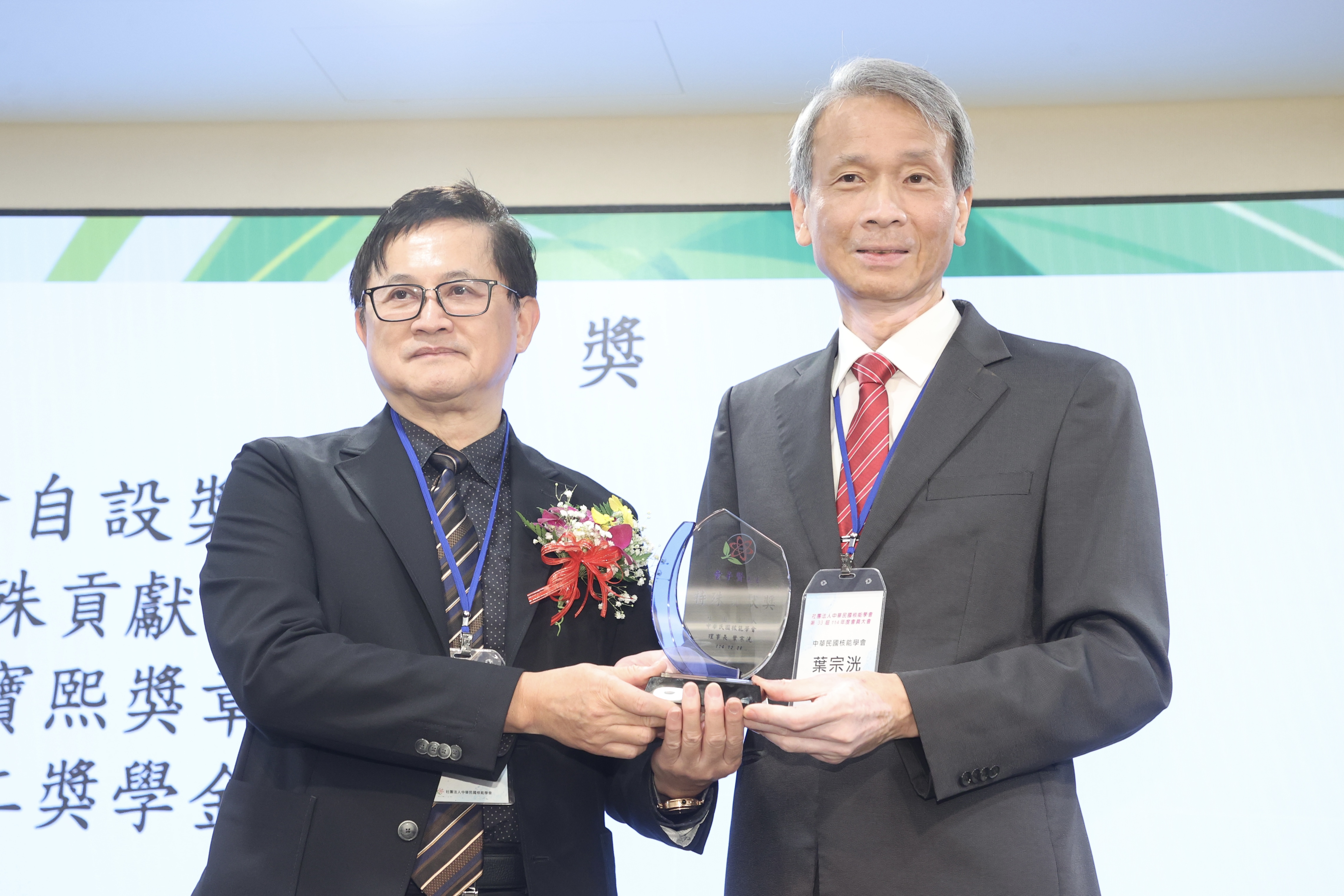 中華民國核能學會上午舉行會員大會,理事長葉宗洸(右)頒發「特殊貢獻獎」給予和碩科技董事長童子賢(左),以表揚他在許多場合對核能民生應用做的努力。記者葉信菉/攝影