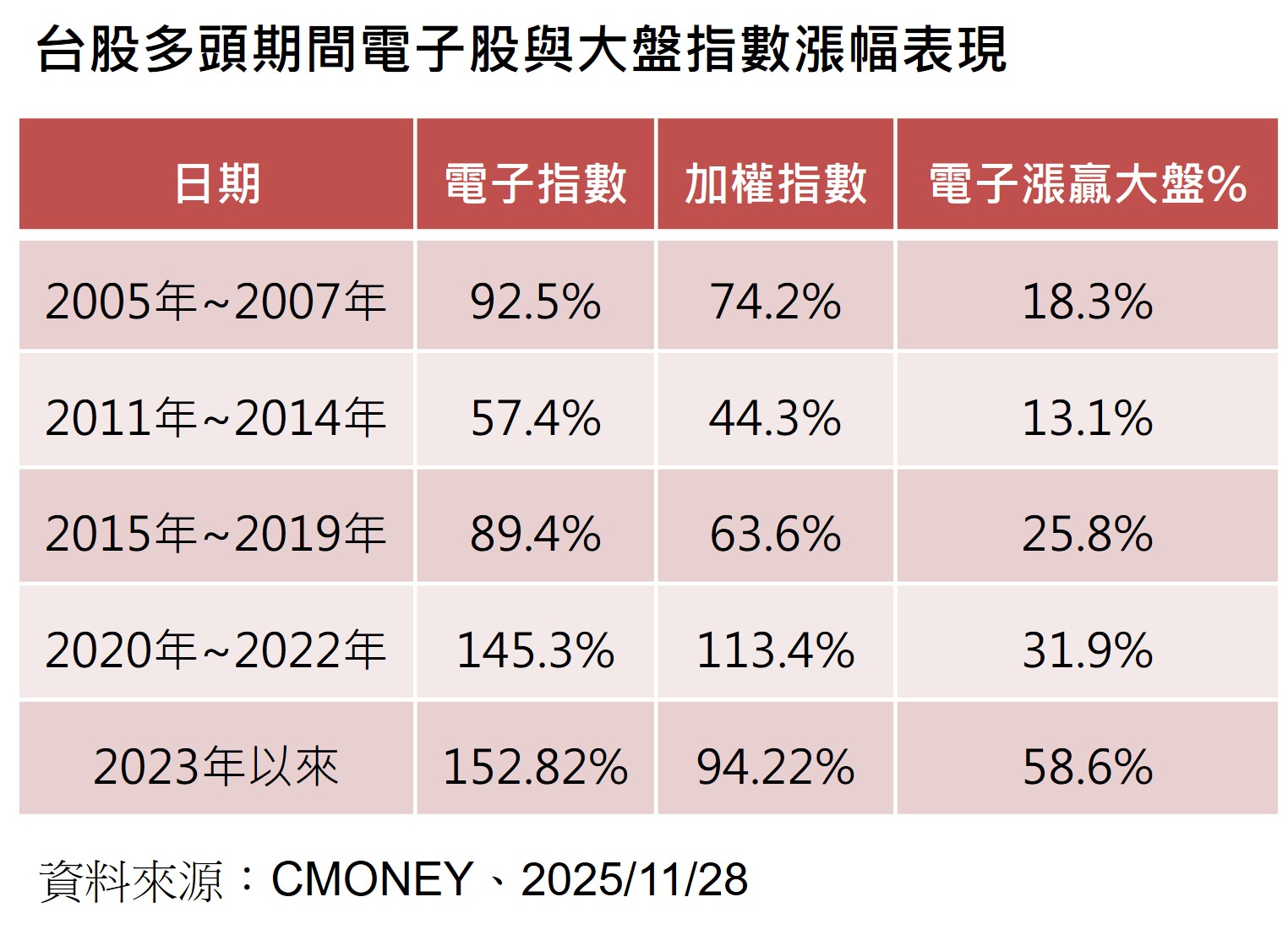 台股多頭期間電子股與大盤指數漲幅表現。(資料來源:CMoney)