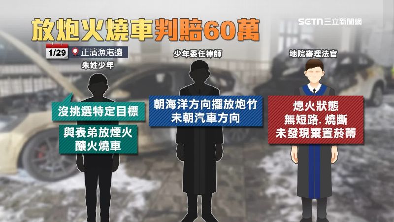 雙方開庭時,朱姓少年曾表示沒挑選特定目標,律師也主張炮竹是朝海洋方向,絕非火警主因。但法官指出起火點正是在後方車輛,當時車子處於熄火狀態,沒短路等異常情形,現場也沒發現廢棄菸蒂,再者根據監視器比對,少年是9點22分引燃沖天炮,2秒內車輛起火燃燒,不到30秒火勢延燒兩車,認定少年燃放炮竹釀災可能性大,判賠60萬元,少年父母也要負連帶賠償責任。