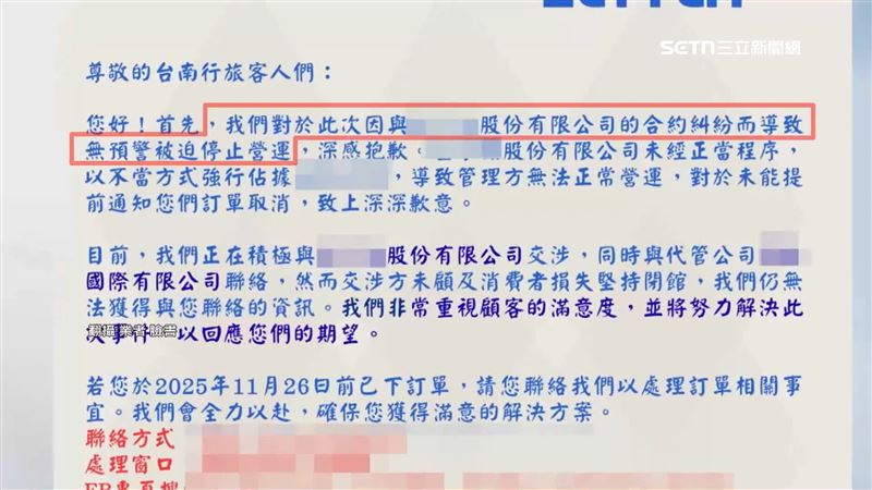 無預警倒閉,旅店官網疑似照常營運,造成訂房沒得住,查看業者官網,公告貼出道歉信,表明是合約糾紛,導致無預警被迫停止營運。