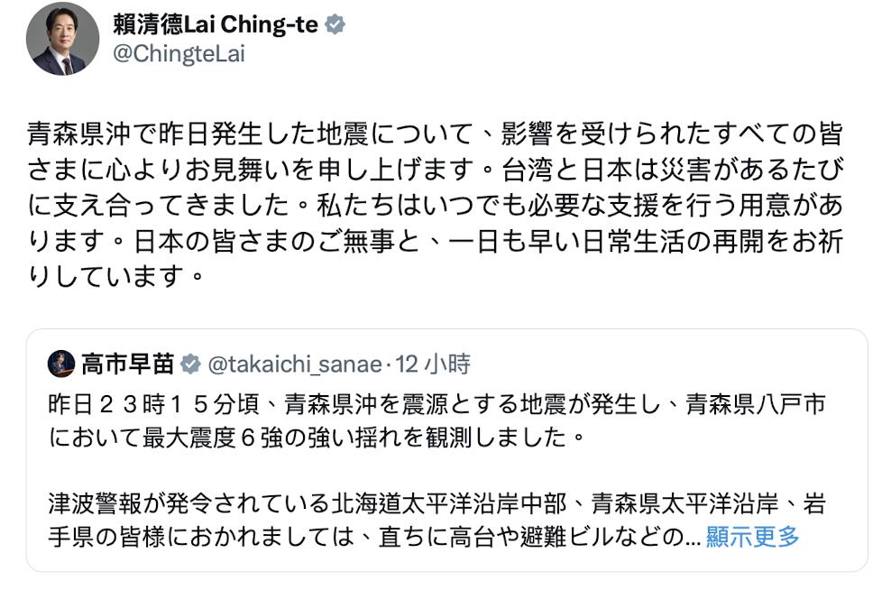 賴總統說,「對於日本青森縣外海昨日傳出的地震災情,我想向所有受影響的民眾表達誠摯的關心和慰問。面對災難,台日始終互相扶持。我們隨時準備提供必要的協助,也祈願日本民眾平安、盡早恢復正常生活。」