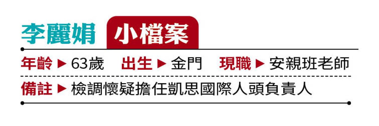 更何況凱思國際登記的營業項目與安親班的補教業務沒有任何關聯;根據經濟部商工登記資料顯示,凱思國際成立資本額從2021年創立的100萬元,到2023年增至1,500萬元,李麗娟都是檯面上唯一的股東,總出資金額達1,490萬元,身為安親班老師的她,何以能有如此龐大的資本來源?加上進出的金流顯示都與她無關,足可證明李麗娟只是人頭。