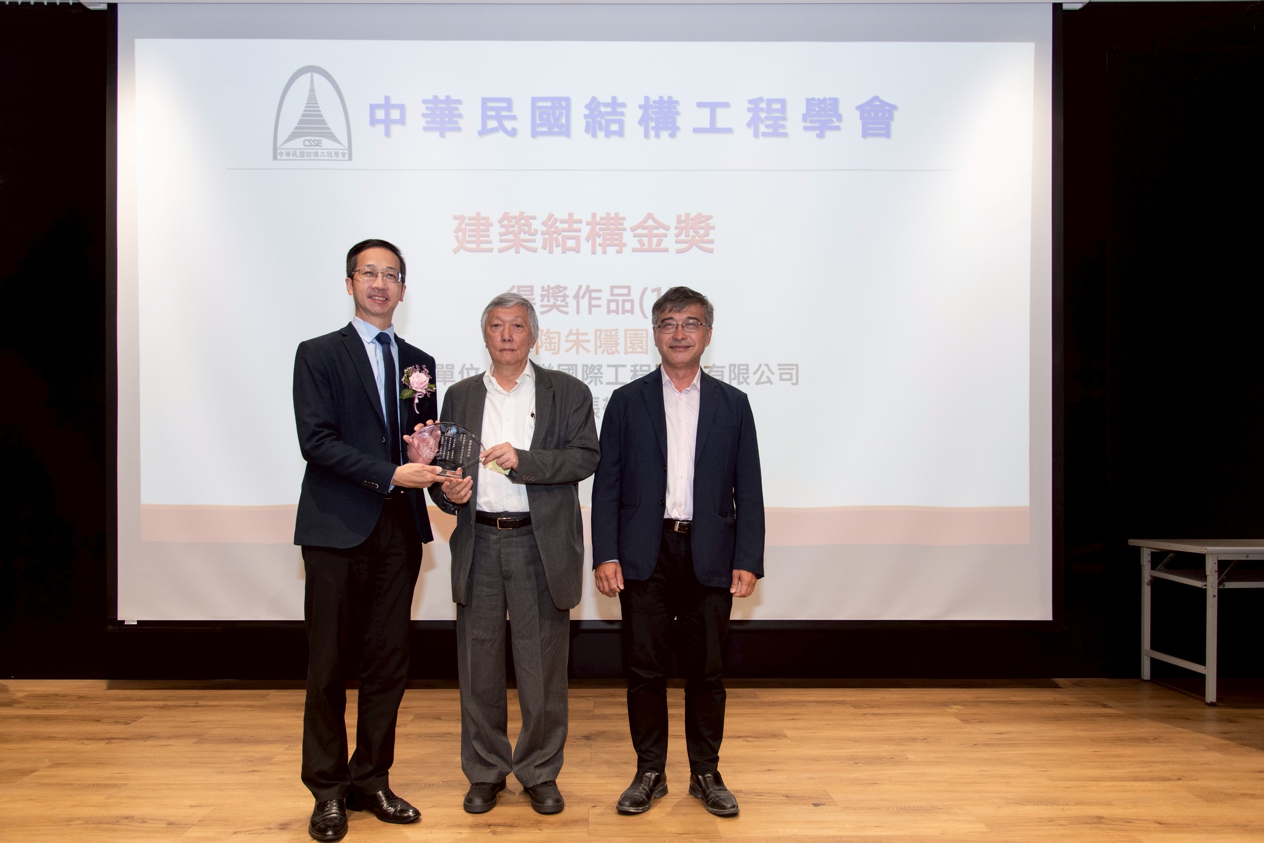 陶朱隱園獲得中華民國結構學會結構金獎的殊榮,負責結構設計的傑聯國際工程顧問有限公司總經理張敬禮(圖中)領獎。圖/中工提供