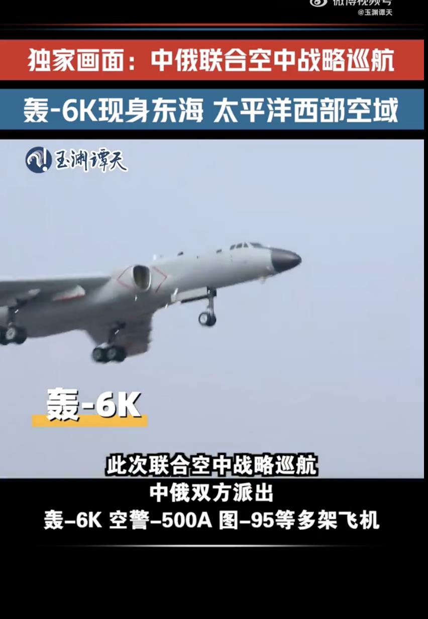 玉淵譚天當晚在微博發布影片指,此次聯合空中戰略巡航,中俄雙方派出多種機型,其中包含解放軍轟炸機「轟-6K」、中型預警指揮機「空警-500A」,以及俄軍轟炸機「圖-95」等多架飛機。