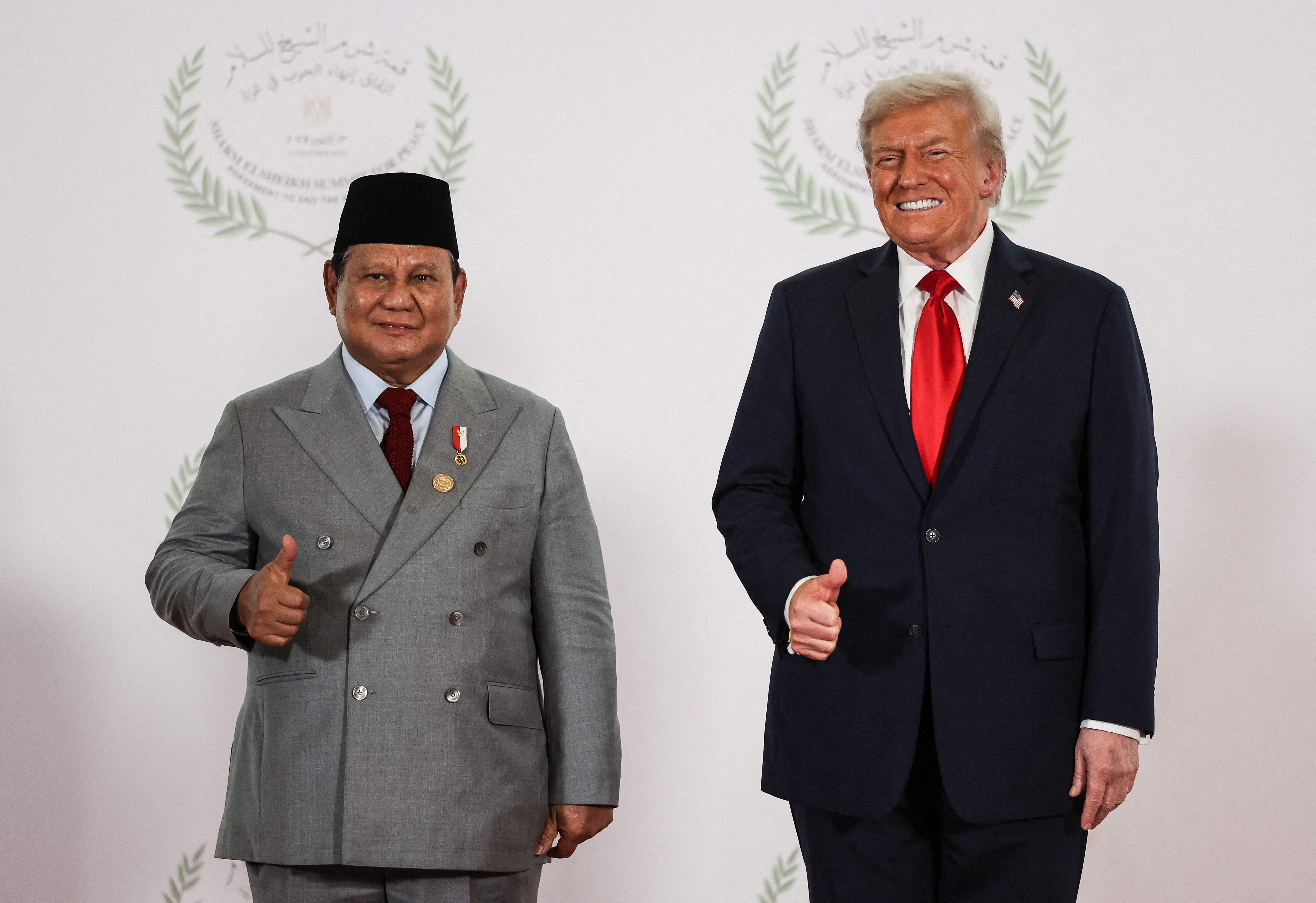 美國總統川普10月13日出席在埃及夏姆錫克舉行的加薩走廊問題峰會上,與印尼總統普拉伯沃合影。法新社