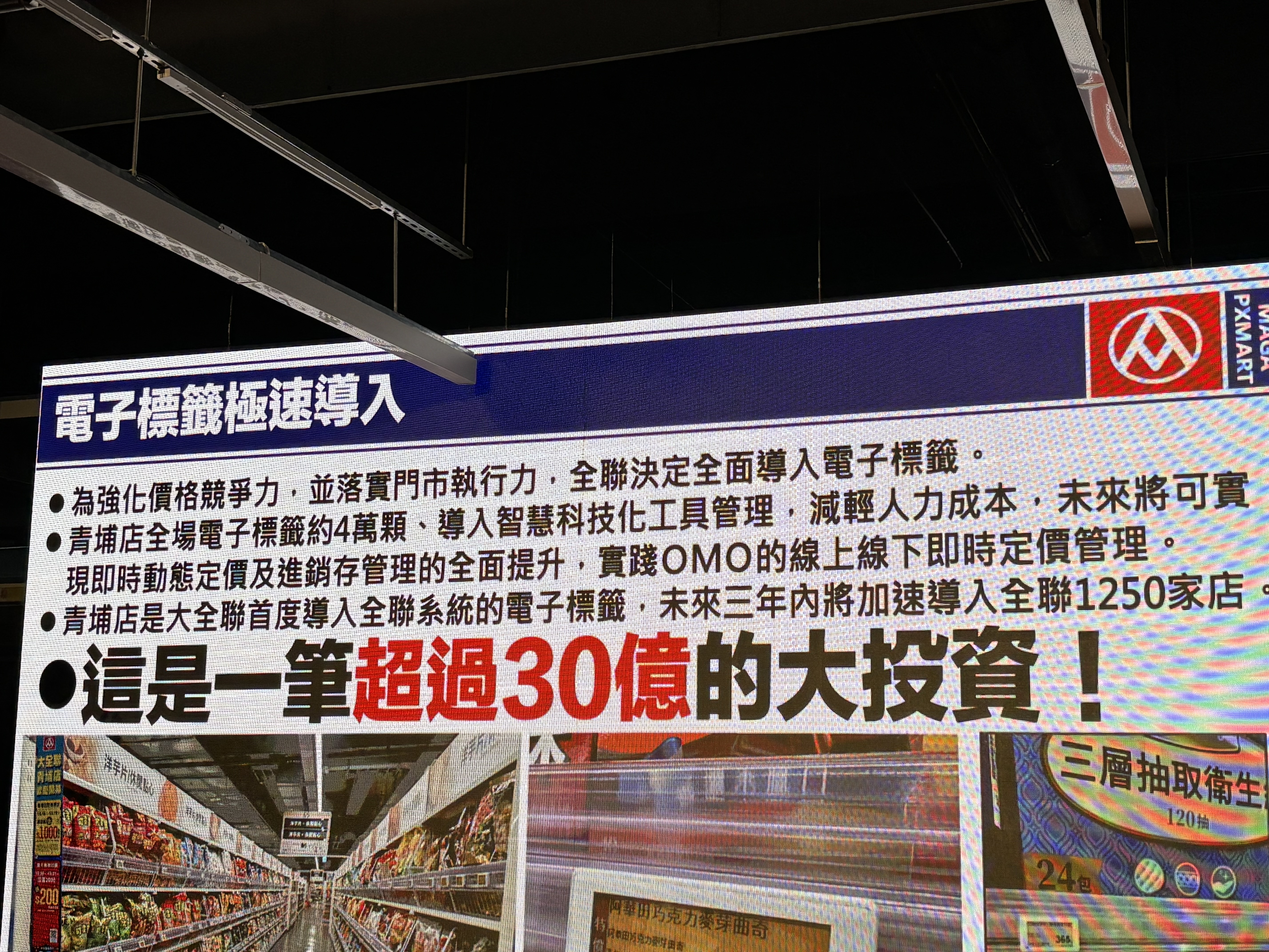 全聯指出,電子標籤搭配智慧化、科技化工具管理,有助降低人力成本、提升進銷存效率,並能實現即時動態定價,推動OMO線上線下價格同步化。未來三年內,全聯將加速導入電子標籤至約1,250家門市,總投資金額達30億元。