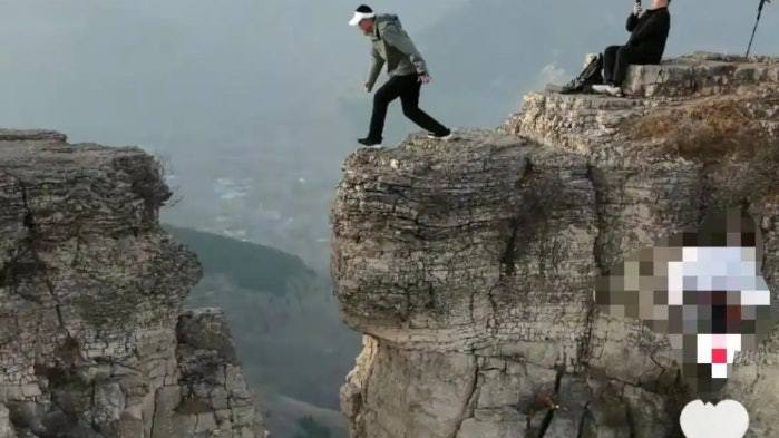 一段攝於山東濰坊的影片於12月7日在網絡流傳,影片中可見多名男子在一處高崖逗留,崖寬數米、高度約10多米,且周邊無護欄或安全提示標誌。其中一名男子在無任何安全措施的情況下,從高崖一側橫跳至對面,身後另有兩名男子為他拍照,對面亦有一名男子在場。