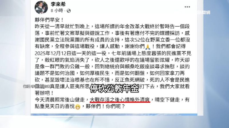立院藍白陣營昨(12)日三讀通過停砍公教年金,全國公務人員協會前理事長李來希PO文感謝國民黨立委,更稱心情清爽,不過網友也翻出2017年韓國瑜的這段話。