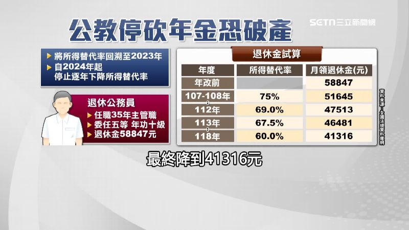 退休老師挺年改盼世代正義,而停砍公教年改三讀,簡單來說就是將所得替代率回溯到2023年,從2024年起,停止逐年下降所得替代率,以一位任職35年主管職、委任五等年功十級的公務員為例,年改前每月退休金58,847元,年金改革後將逐年調降,最終降到41,316元,但這回停砍年金,月退俸將停留在47,513元不再下降,但現任公教約48萬人、退休公教近32萬人,領的人多繳的人少,財務缺口恐怕扛不住。