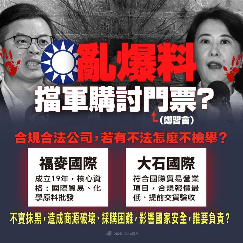 國民黨立委王鴻薇爆料,國防部一樁5.9億元彈藥採購案由一間台南室內裝潢公司得標,質疑兩者關聯性,更稱「小吃店進口快篩」事件重現,案件引發各界關注。國防部第一時間就澄清,依政府採購法規範,公開辦理招標採購,禁得起公開監督,同時憂心相關爆料傷害國防安全。今(14)日民進黨說出重話,抨擊國民黨根本是「亂爆料」、「為什麼不提出證據?為什麼不直接檢舉?」,更質疑一連串操作背後,難道是想換取「鄭習會門票」?