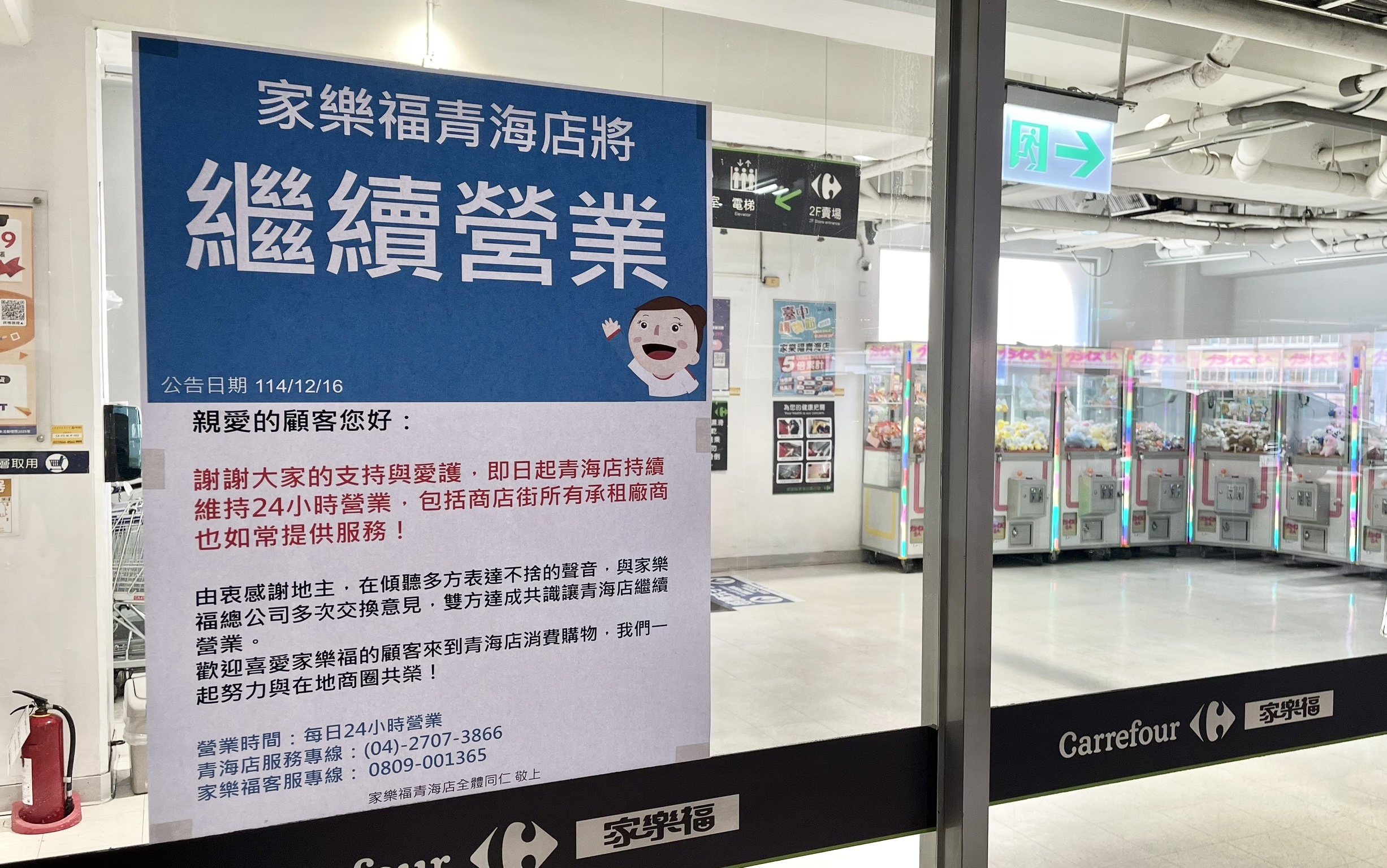 台中家樂福青海店近期傳出將收攤的訊息,家樂福甚至貼出公告將於12月底歇業,引發市場關注,不過16日卻出現大逆轉,店門口突然貼出「繼續營業」的公告,業者也證實確定繼續營運。