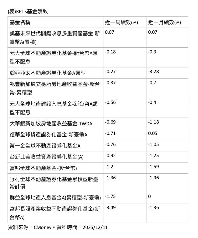 根據CMoney統計,截至2025年12月11日,市面上13檔主要含REITs基金中,僅一檔在近一週與近一月同步維持正報酬,其餘多數基金仍處於修正格局,顯示降息利多尚未全面反映。