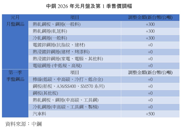 中鋼2026年元月盤及第1季售價調幅。(中鋼/提供)