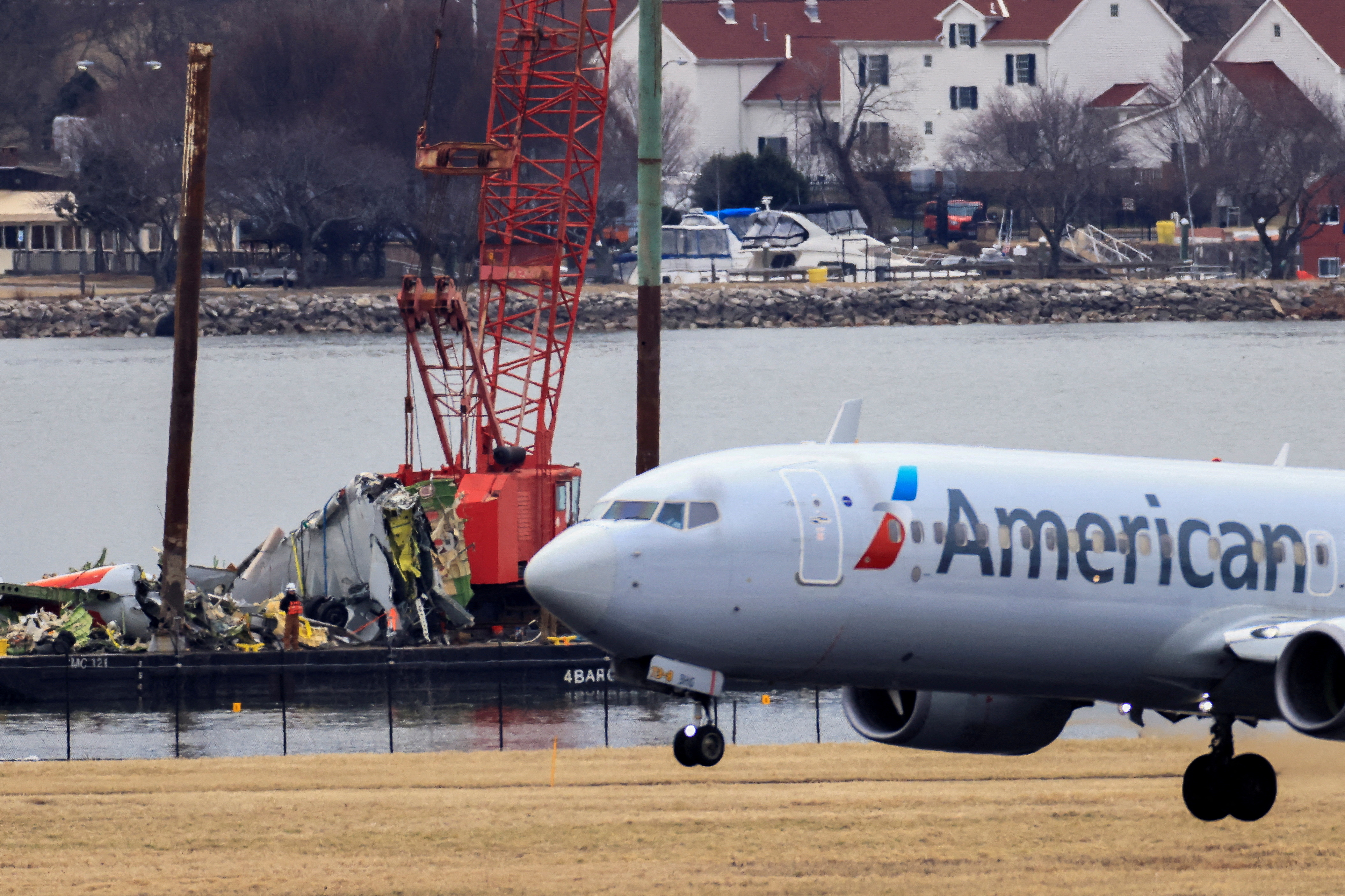 美國華府1月29日發生美國航空5342號班機與美軍一架黑鷹直升機空中相撞,造成67人罹難,圖為一艘載有起重機的駁船2月5日運走部分殘骸,同時一架美航飛機正在降落。路透