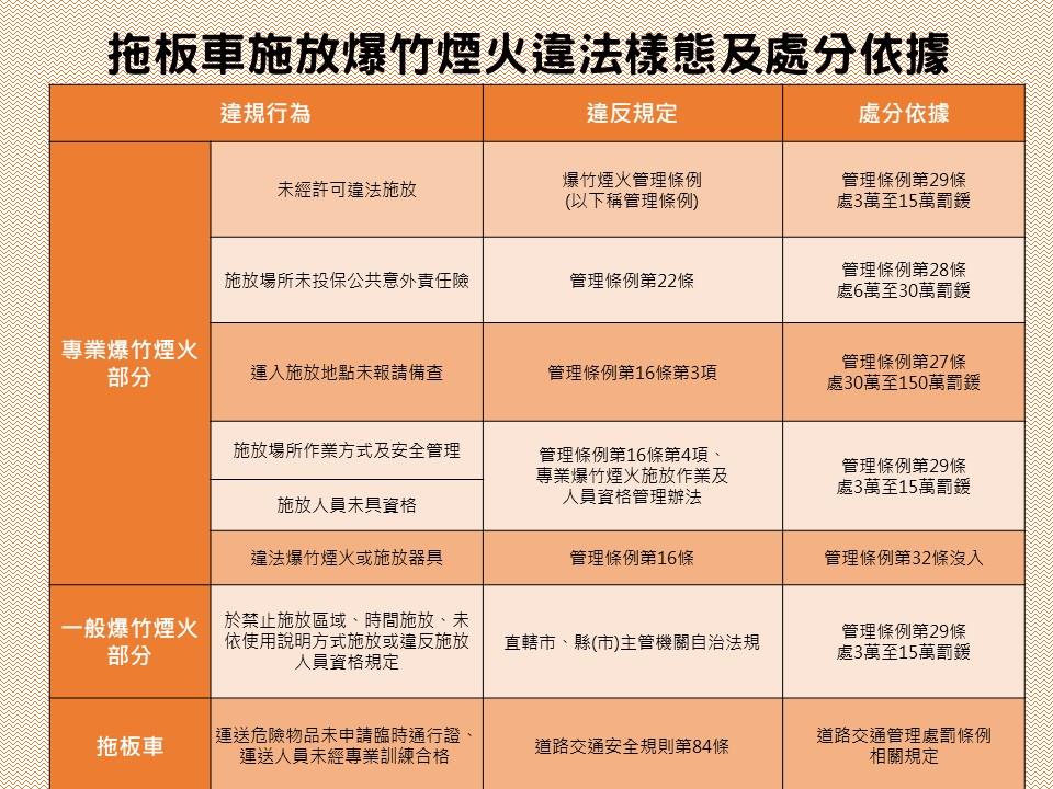 消防署說明,如未依「道路交通安全規則」第84 條相關規定申請車輛載運危險物品,將依「道路交通管理處罰條例」規定處罰;未依照「爆竹煙火管理條例」及地方自治法規的規定施放爆竹煙火,也將依法裁處3萬元以上、15萬元以下罰鍰;運入施放地點如未向消防局申請核備,則裁處30萬元以上、150萬元以下罰鍰。