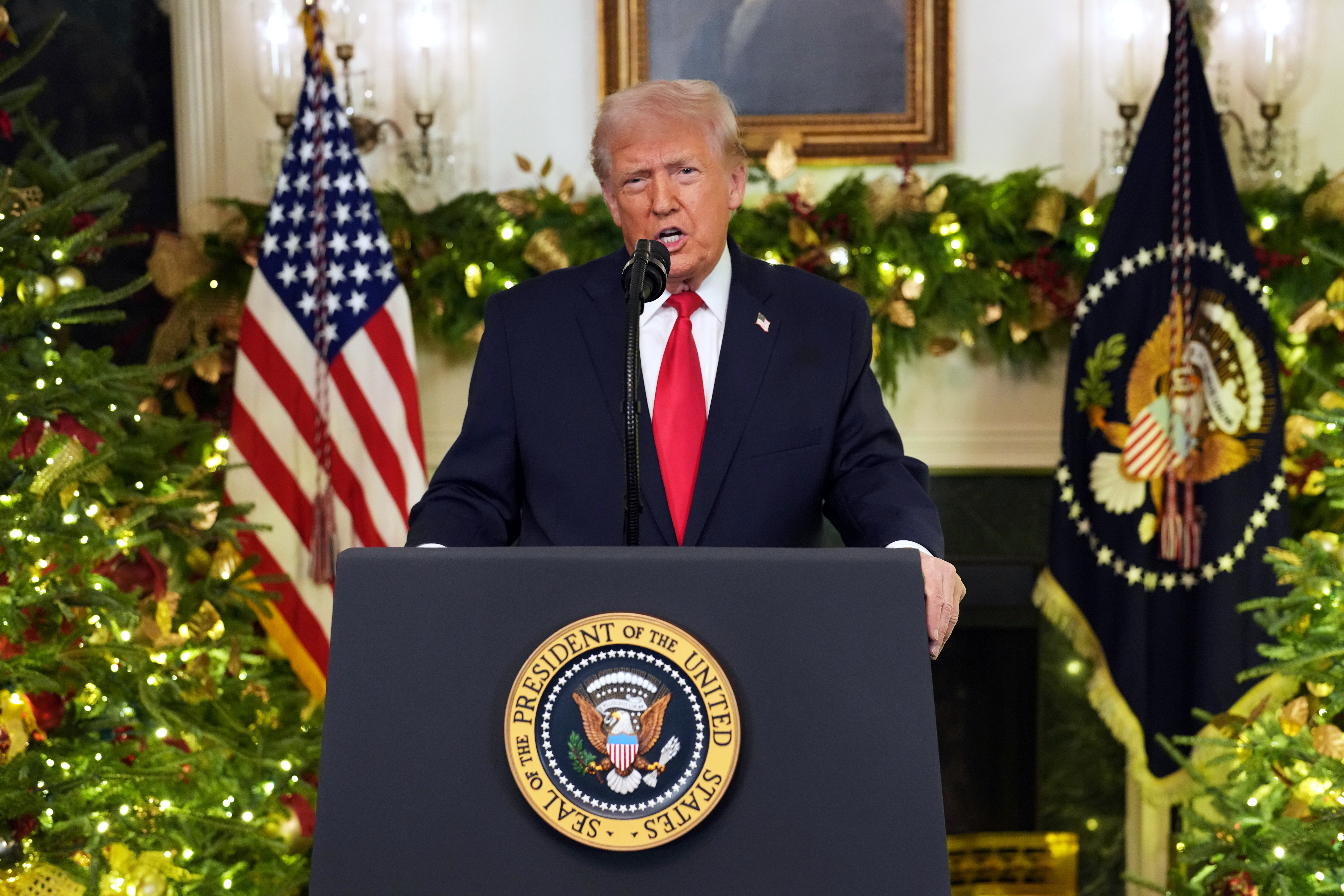 川普總統在白宮外交接待廳向全國發表談話。美聯社