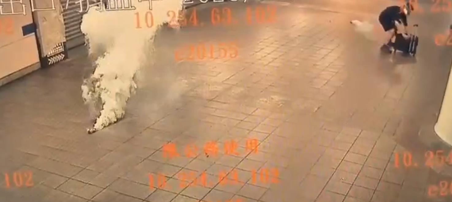 台北車站M8出口與M7出口處的地下一樓月台層,今天下午5時24分傳出有人丟擲煙霧彈,造成月台層濃煙密布。台北市議員游淑慧指出,嫌犯應該是有預謀的犯案。從站內監視器畫面可知,身上還持有刀具。