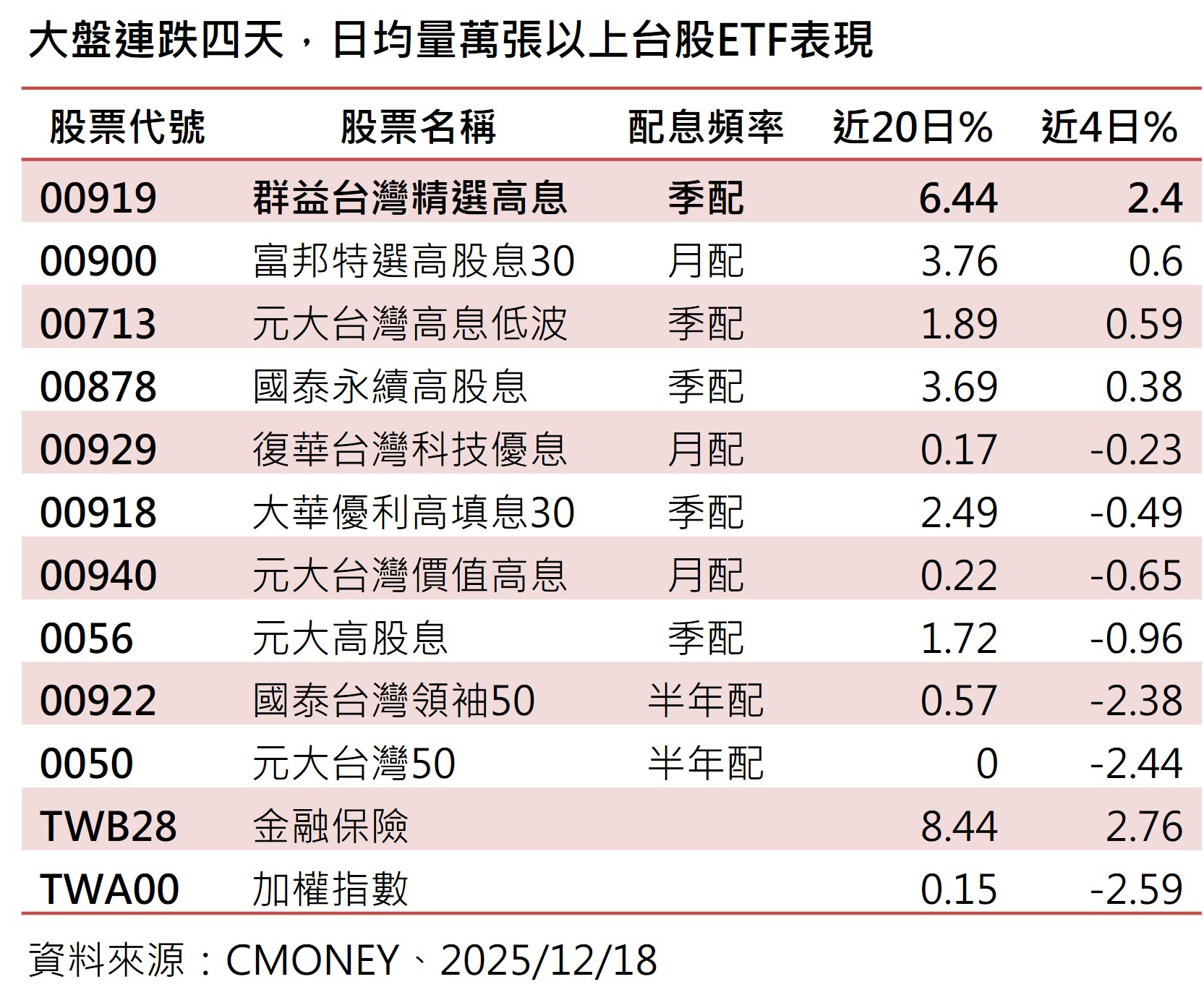 大盤連跌四天,日均量萬張以上台股ETF表現。(資料來源:CMONEY、2025/12/18)