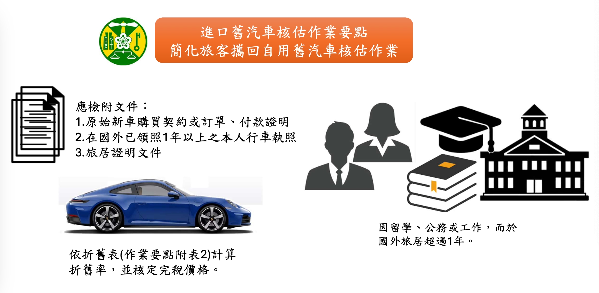 為簡化核估作業,民眾可清楚瞭解其應繳納之進口稅費,並避免徵納雙方爭議,爰於作業要點第8點增訂,旅客因留學、公務或工作,而於國外旅居超過1年,提供原始新車購買契約或訂單、付款證明及在國外已領照1年以上之本人行車執照,並檢附旅居證明文件者,海關得直接依折舊表(作業要點附表2)計算折舊率,並核定完稅價格。