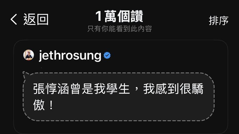 宋學維看完張惇涵在立法院可圈可點的表現後,於《Threads》發文「張惇涵曾是我學生,我感到很驕傲!」是後發現貼文於短時間內爆衝到1萬個讚,直言「張惇涵應該說對或做對了什麼!」