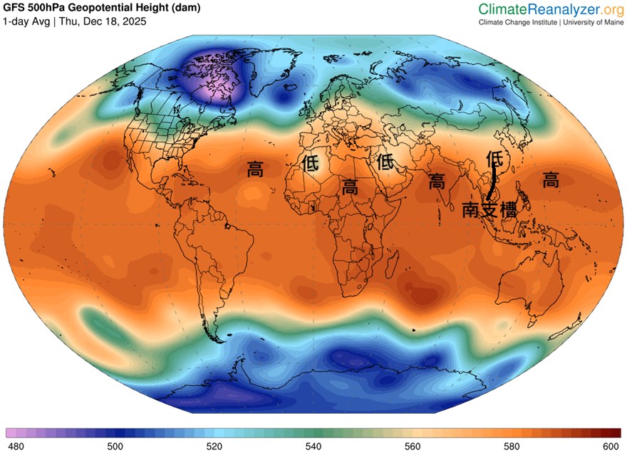 今天降水回波明顯,是南支槽接近的影響;「這個南支槽有點特別」,前中央氣象局長鄭明典在臉書PO出500百帕高度場圖,他表示,台灣西側的南支槽的槽線,其實是一系列短波槽、脊中的一段。這個現象是氣象學裡「正壓不穩定」的反應,能量由噴流的動能而來,學理上是平均緯流動能或超長波動能轉換成短波動能。