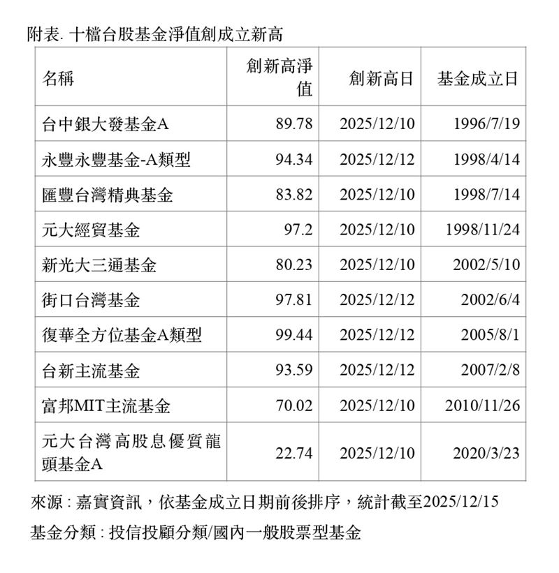 台股年底「作帳行情」與「紅包行情」雙軌並進,市場投資氛圍轉趨樂觀,儘管外界對AI產業存在泡沫化疑慮,但受惠於聯準會(Fed)如預期降息1碼,加上國際資金加速回流,台股走勢強勁,進一步帶動台股基金報酬表現。根據嘉實資訊最新統計,截至12月15日止,共有10檔台股一般股票型基金淨值創下歷史新高,展現年底資金行情威力。