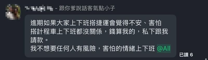 一名網友在Threads分享對話截圖,看到老闆在群組發聲,「進(近)期如果大家上下班搭捷運會覺得不安、害怕,搭計程車上下班都沒關係,錢算我的,私下跟我請款,我不想要任何人有風險,(帶著)害怕的情緒上下班。」