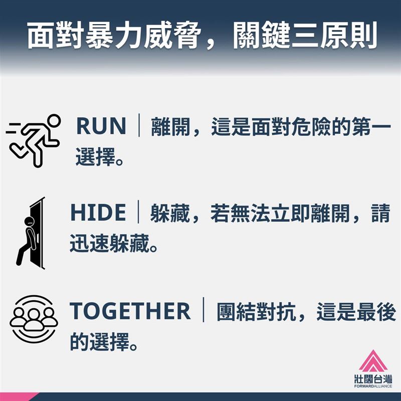 而民眾能多做些什麼呢?吳怡農分享壯闊台灣的貼文並指出,第一,平時的警覺,看到異狀、開口通報;第二,事故現場,觀察環境,自身安全第一;第三,面對暴力威脅的優先順序:run, hide, together (離開、躲藏、集體對抗);第四,遇到執法人員,不要衝向他們,不要尖叫,迅速離開。請瞭解,員警的首要工作是排除威脅,但充滿人潮的現場,會增加他們執行任務的困難。