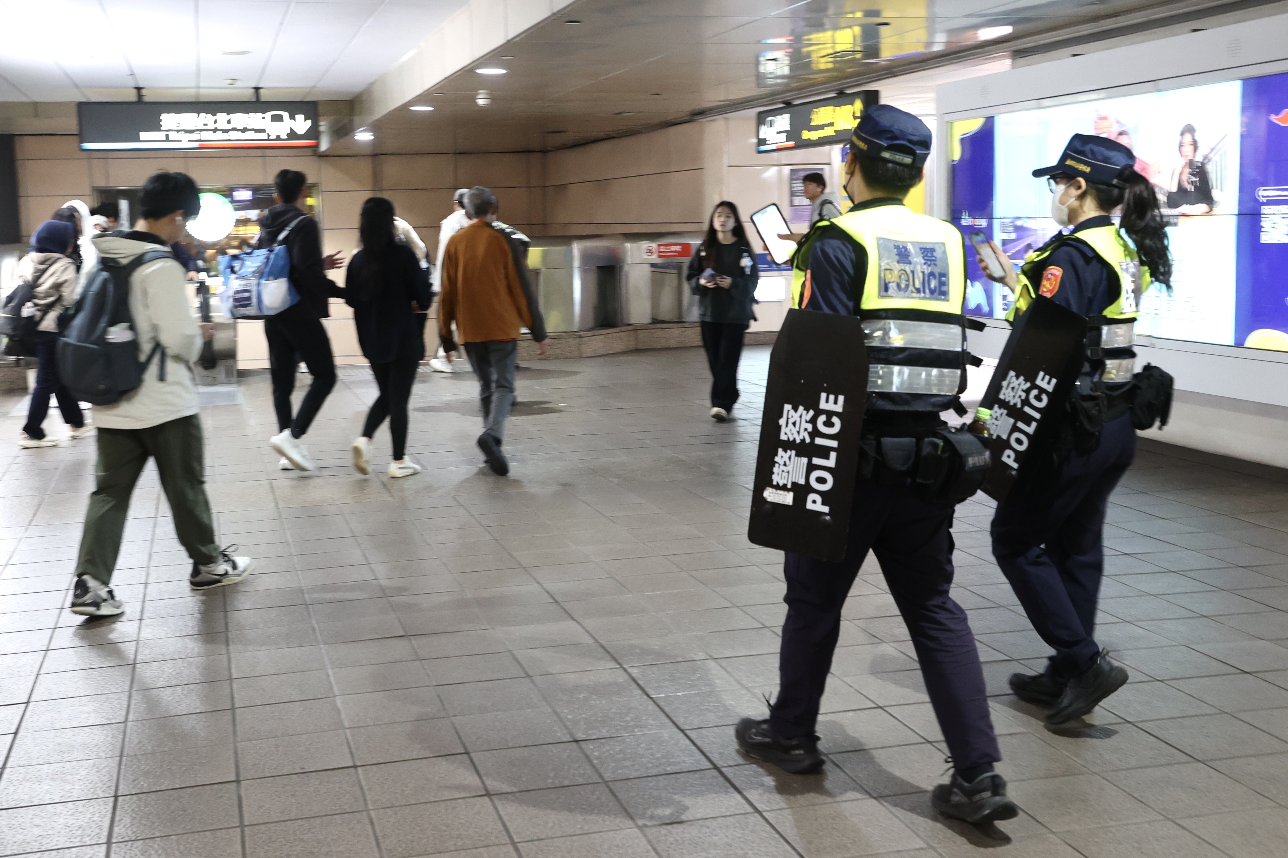 台北捷運發生無差別殺人不幸事件,警方密集在北車捷運站體周邊巡邏,並手持盾牌加強戒備。記者林俊良/攝影