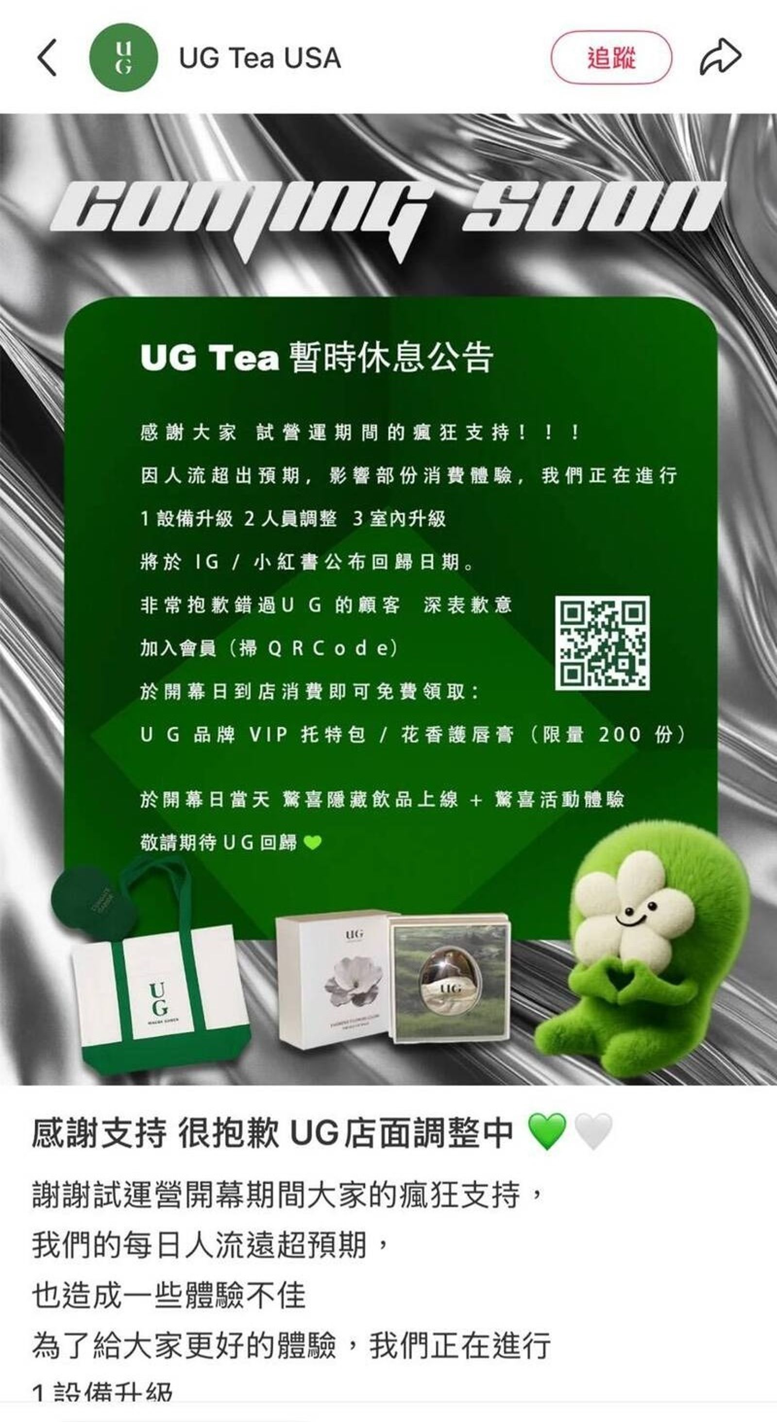對此,UG Tea則在12月11日於官方社群做出回應,稱因為生意太好,造成顧客體驗不佳,也發現了一些問題,因此正在進行店內全面升級,預計2週後公告重新開幕日期。