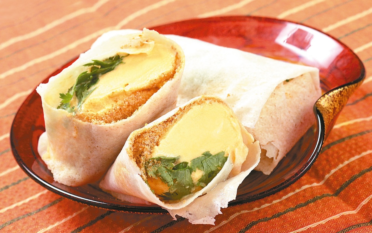 台灣經典小吃「花生捲冰淇淋」以潤餅皮包裹花生糖粉、冰淇淋與香菜聞名,特殊的鹹甜滋味是許多人的最愛。圖/聯合報系資料照