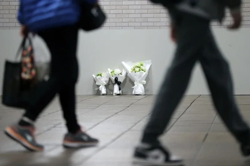 北市隨機攻擊案發生後,陸續有民眾到北捷M8出口,獻上花束悼念受害者。記者蘇健忠/攝影