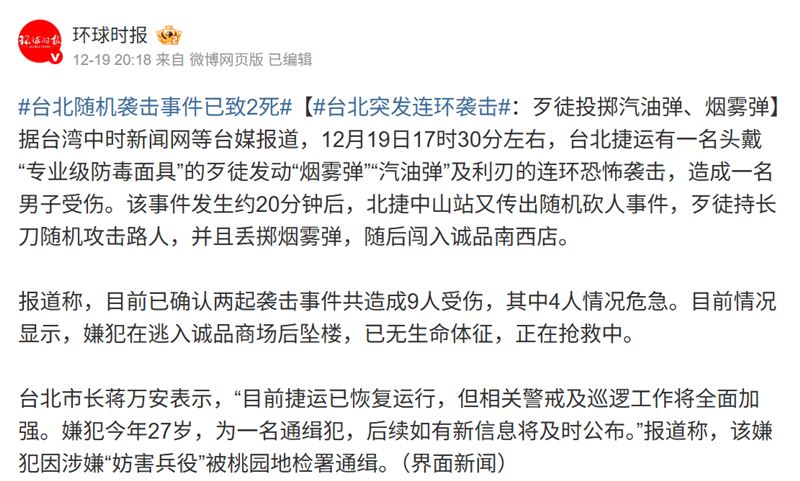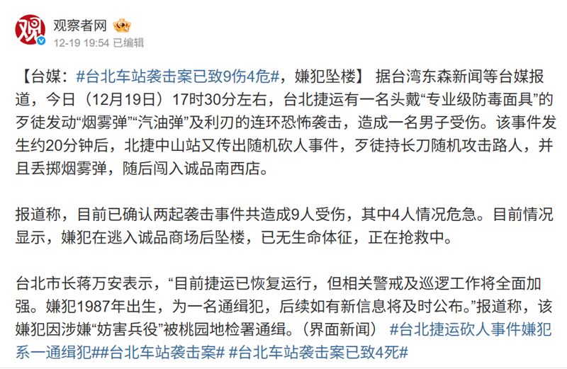 19日發生的台北車站與捷運中山站連續攻擊事件引發國際關注。近日有網友在社群平台「Threads」發文指出,中國平時熱衷於對台進行「文字吃豆腐」攻勢、要求標註「中國台灣」的中國媒體,在報導這起負面社會案件時,文字運用出現了微妙的轉變。