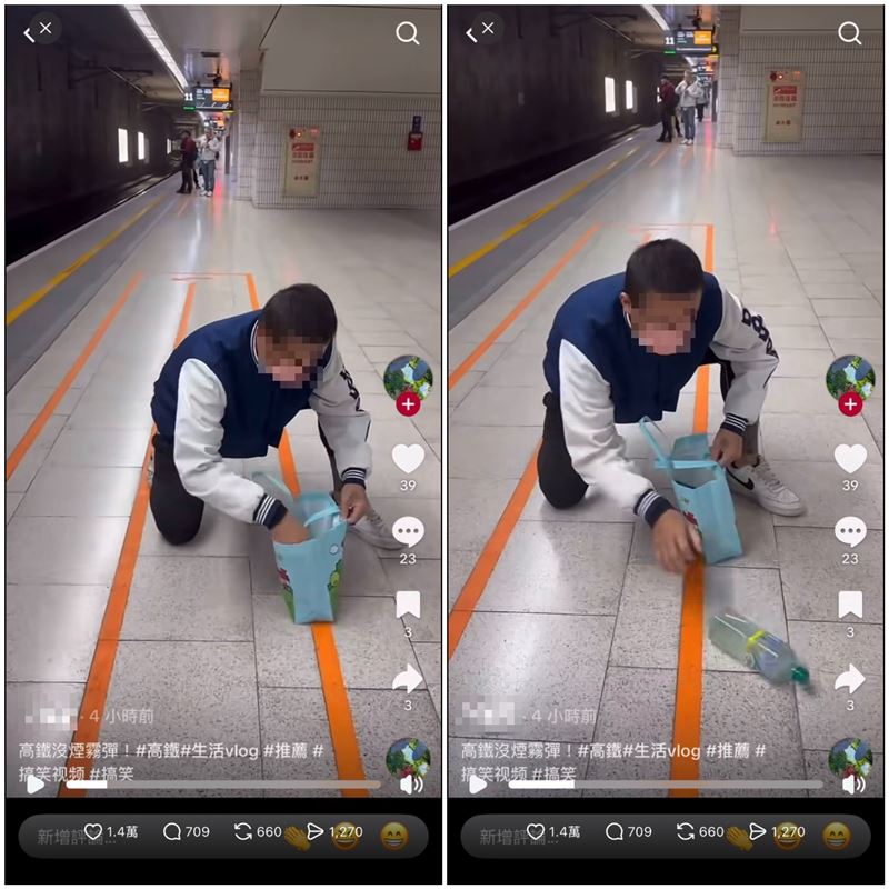 一名男子在高鐵月台故意蹲下,並從袋子裡拿出寶特瓶丟擲,製造聲響,整段內容被他錄製成影片並PO到TikTok。男子還在影片寫下「高鐵沒煙霧彈」、「搞笑視頻」、「生活Vlog」等語。