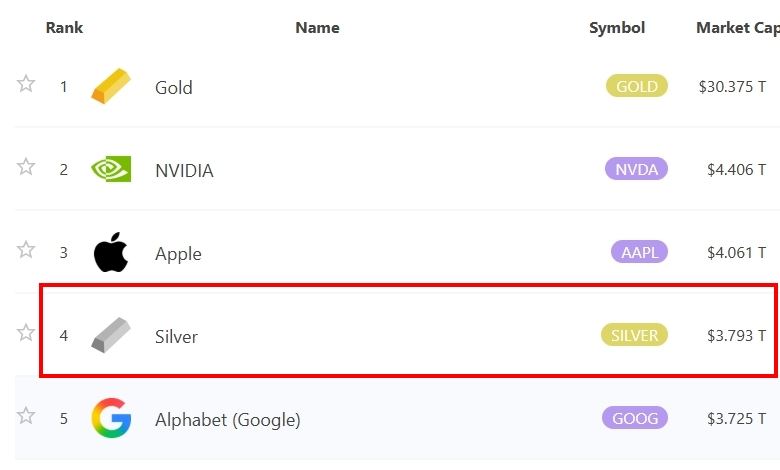 價格狂飆也直接推升白銀市值水位。根據全球資產排名,白銀已正式擠下Alphabet,站上全球第四大資產寶座;反觀比特幣在近期修正下,排名滑落至第八。市場直言,這波不是單純的原物料行情,而是資金對「實體資產」重新定價的結果。