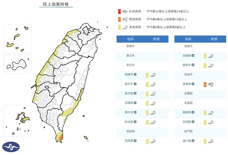 東北風明顯偏強,中央氣象署發布陸上強風特報,今(22)日清晨至23日晚上屏東縣局部地區有平均風9級以上或陣風11級以上發生的機率。另外,桃園市、新竹市、新竹縣、苗栗縣、臺中市、彰化縣、雲林縣、嘉義縣、臺南市、臺東縣(含蘭嶼、綠島)、澎湖縣、連江縣局部地區有平均風6級以上或陣風8級以上發生的機率,提醒民眾注意防範。