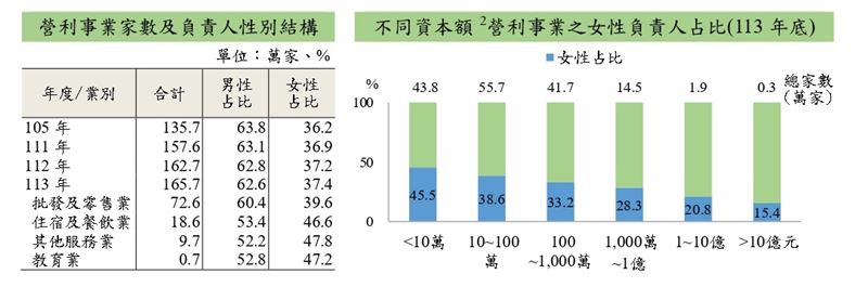 若從資本額規模來觀察,則呈現出鮮明的性別差異,顯示「微型創業」是女性老闆的主戰場。根據統計,全台資本額在10萬元以下的營利事業約有43.8萬家,而10萬至100萬元之間的則有55.7萬家,兩者合計占了總家數的六成 。在資本額低於10萬元的微型企業中,女性負責人的占比高達45.5%,是所有資本額級距中最高的;然而,隨著資本規模擴大,女性佔比則呈現明顯遞減趨勢,在資本額超過10億元的大型企業中,女性負責人僅占15.4% 。這反映出女性創業者多選擇資金門檻較低的行業起步,而資本密集型與大型企業目前仍由男性掌握主導權 。
