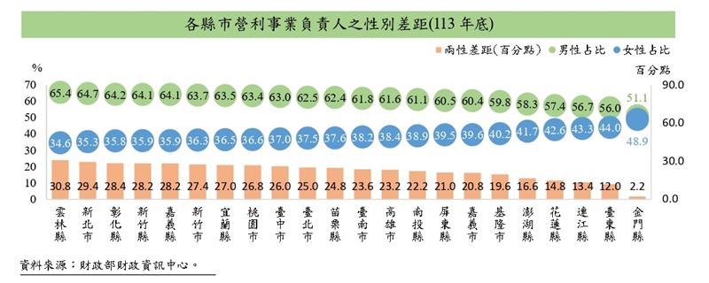 最後,從地域分佈的視角來看,全台各縣市雖均呈現男性負責人多於女性的局面,但產業結構的差異直接影響了性別差距的大小 。雲林縣因農林漁牧與營建工程等勞力密集型產業占比較高,導致女性投入度較低,兩性負責人占比差距達30.8個百分點,為全國最大,新北市則以29.4個百分點的差距緊追在後 。
