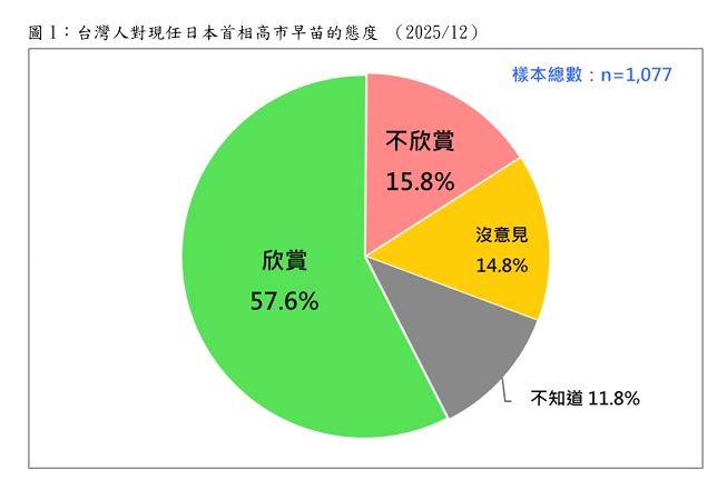 台灣民意基金會今天公布最新民調,題目為,「日本史上第一位女首相高市早苗,上任不到兩個月,施政廣受矚目,其中包括『台灣有事,即日本有事』的明確表態,引起中國強烈不滿。一般說來,您欣不欣賞高市早苗這位日本政治人物?」