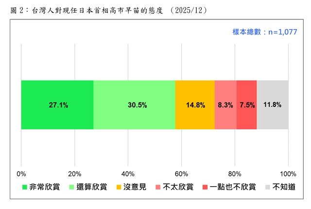 民調結果顯示,27.1%非常欣賞、30.5%還算欣賞、8.3%不太欣賞、7.5%一點也不欣賞、14.8%沒意見、11.8%不知道。最新民意顯示,二十歲以上台灣人,五成八欣賞高市早苗,一成六不欣賞,二成七沒意見、不知道。