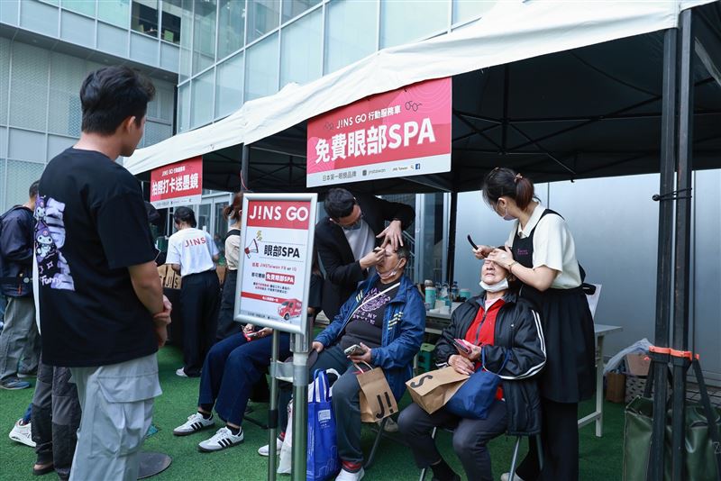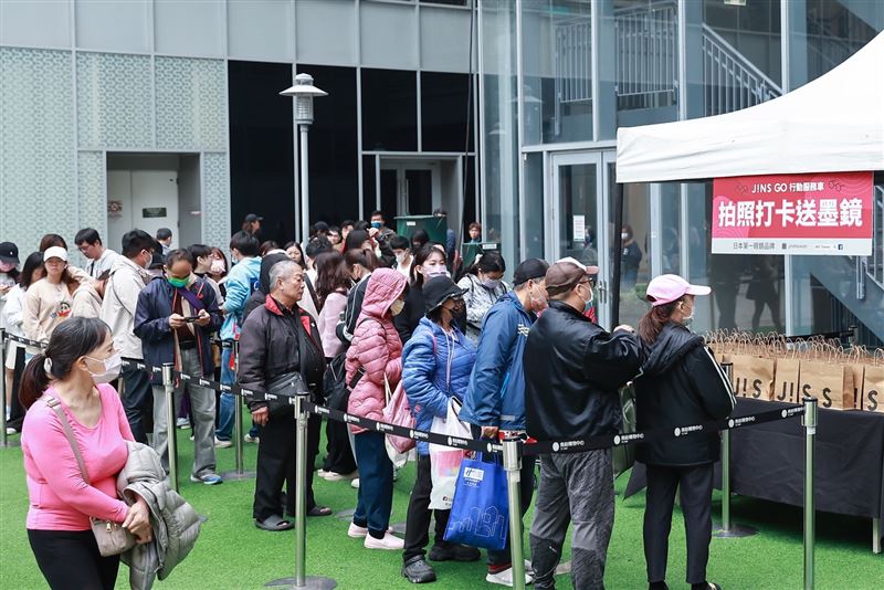 JINS GO活動誠意滿滿,現場提供的免費服務與好禮成為吸客關鍵。除了專業的「眼鏡調整」、「保養諮詢」,與舒緩疲勞的「養眼SPA」服務外,最受矚目的莫過於「打卡免費送墨鏡」活動,吸引民眾攜家帶眷提早卡位。