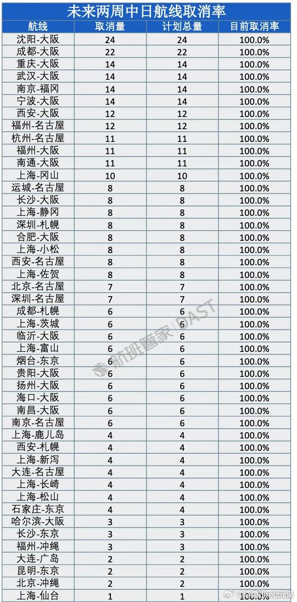 11月24日中國財經媒體《第一財經》曾報導,根據航班管家DAST數據,截至11月24日10點,已有12條中日航線取消所有航班,如今影響進一步擴大。