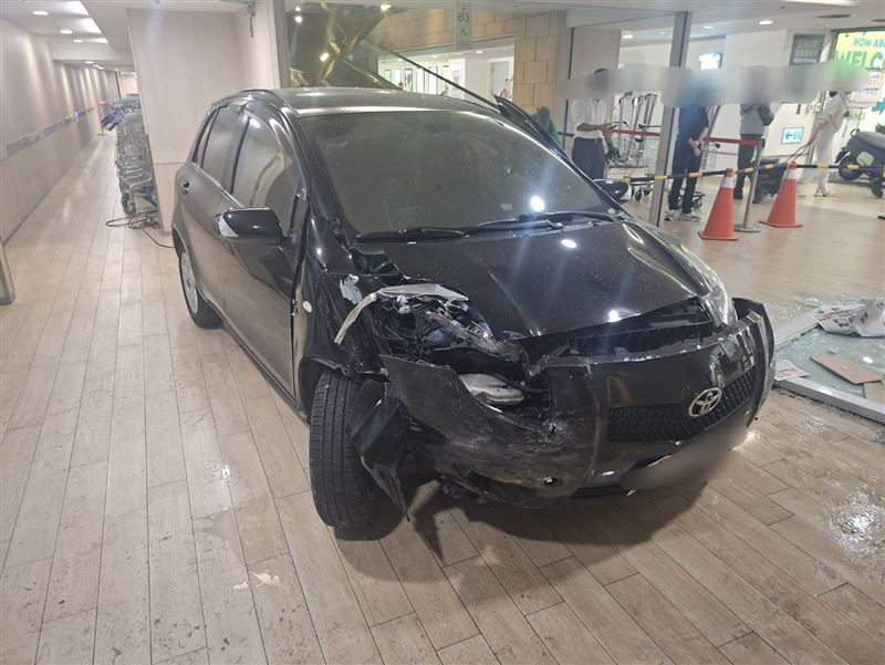 現場畫面中,黑色轎車橫停在賣場入口處,車頭保險桿掉落,右前方也撞凹,左側車門凹陷,最慘的是無辜受害的賣場玻璃門,被撞到整片玻璃門噴飛,地上全是碎裂的玻璃,工作人員正在善後;這一撞,嚇壞了所有人。