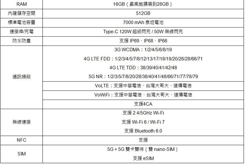 續航與充電方面,realme GT 8 Pro內建7000mAh泰坦電池,搭配120W SUPERVOOC超級閃充,從1%快速充至100%僅需43分鐘;同時是realme台灣市場首部搭載50W無線閃充的機型,從1%充至100%僅需79分鐘(以上數據皆為realme實驗室測試結果),無論長時間直播、遊戲或影像創作都能安心續航;此外,realme GT 8 Pro也支援 eSIM技術,便利經常出差、旅遊的用戶,隨時隨地輕鬆享受國際漫遊與上網。