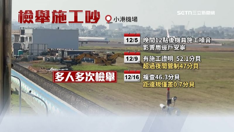 高雄小港機場路一帶,上百戶居民夜不成眠,白天飛機起降噪音,晚上換施工惱人。原來小港機場正在進行滑行道系統改善工程,居民PO檢舉單,5日晚上12點過後,機具施工噪音影響安寧,9日環保局到場發現分貝52,已經超過夜間管制標準的47,16日再複查,分貝距離違規只差不到1分貝,而且機場周邊已經多人多次檢舉。