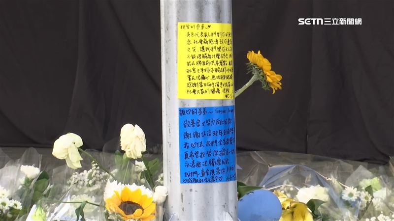 鮮花擺了一圈又一圈,事發第五天,不少人前往事發地中山致意,燈桿上顯著的一藍一黃紙條全是蕭姓騎士姐姐對他的思念,兩度到現場的她,對心愛的弟弟說「社會病態導致你遭受無妄之災,讓我們與你天人永隔」,更說「不能理解為什麼冬至,只能在牌位前供奉餐點」,她感到痛心無法克制眼淚。
